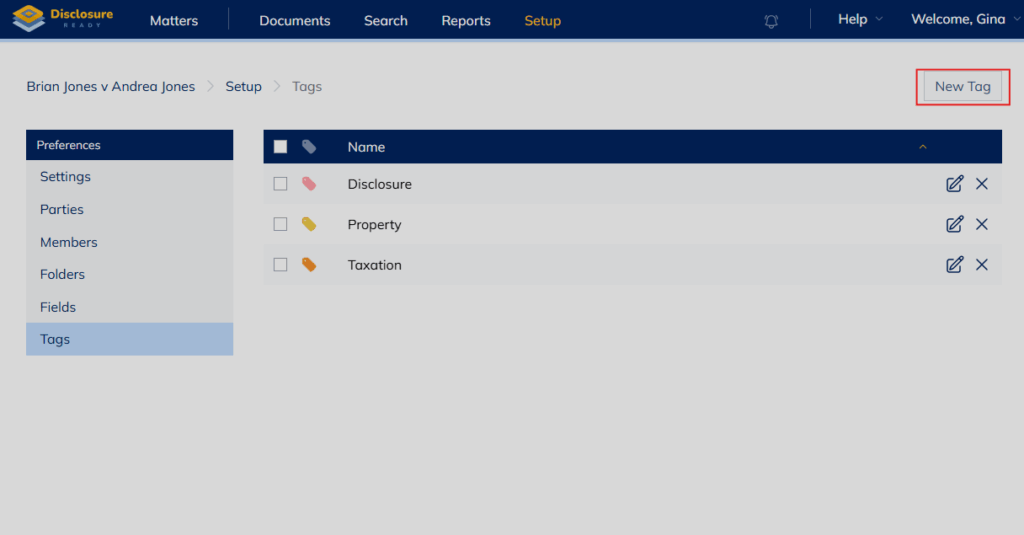 To set up tags for a matter, click on the edit button on the right hand side of the matter name: