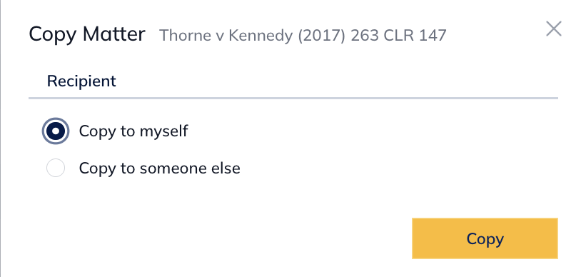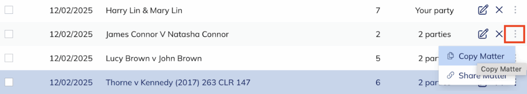 The whole matter can be copied and all folders, documents and briefs are copied across. From the matter dashboard select the matter, and from the right-hand side three dots, select the option to copy the matter.