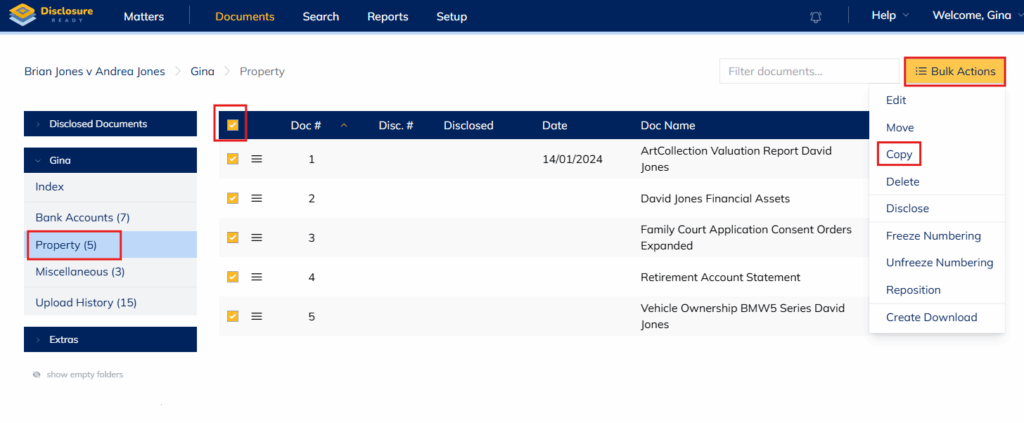Click on a matter and click on a folder from which you wish to copy the document. Select the white box in the first column of the central heading bar. This will open the Bulk Action button options which include copy. Any of the documents can be unticked if they do not need to be copied.