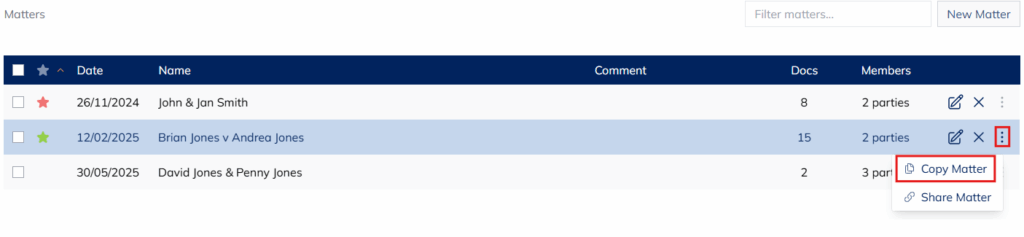The whole matter can be copied and all folders, documents and briefs are copied across. From the matter dashboard select the matter, and from the right-hand side three dots, an option to copy the matter is available.
