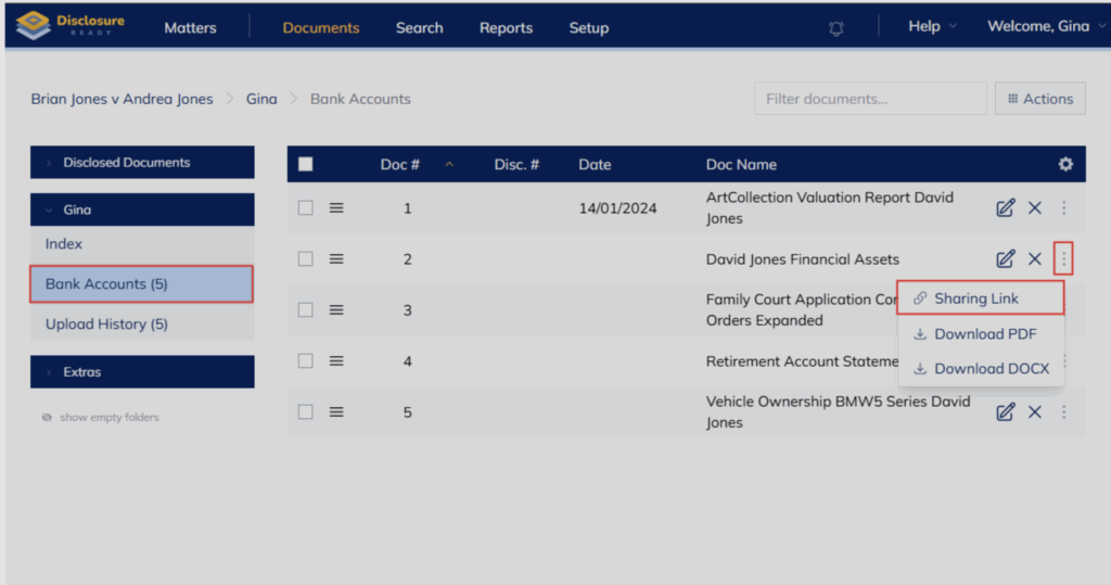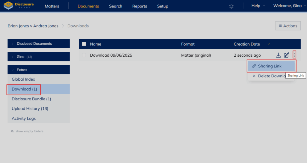This article will explain how to share a document, a download or a disclosure bundle via a link. Disclosure Ready Subscribers can share a link with any party without downloading the file to any shared drive first.