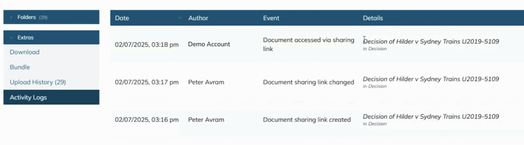 The shared link will require the user to log in, and once the link has been accessed this will be recorded within the matter’s “Activity Logs” (accessible under “Extras” in the “Documents” tab).