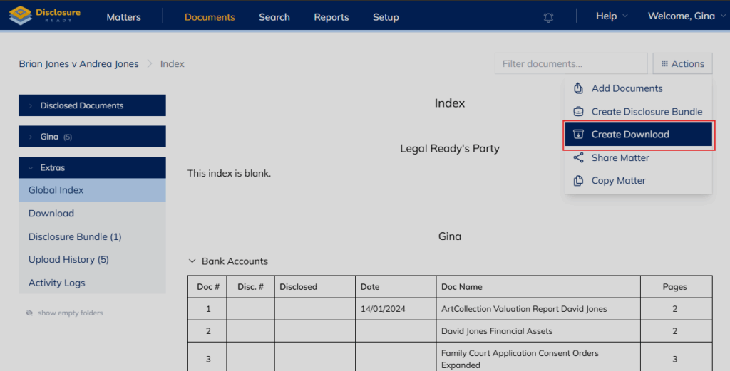 In the Documents tab, go to Actions and select “Create Download”: